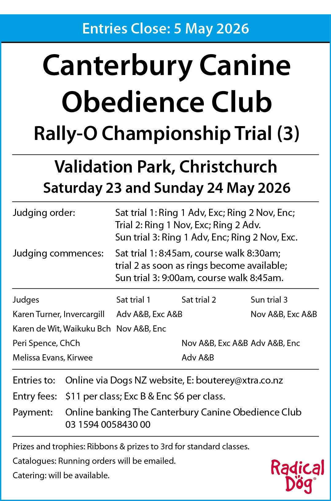 Obedience, Agility and Rally-O Competitions.